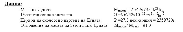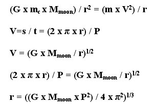 Нека mc e масата на кораба, в който се намира третият астронавт. Тогава гравитационната сила на Луната трябва да бъде равна на центробежната сила на кораба, намиращ се на кръгова орбита на разстояние r.